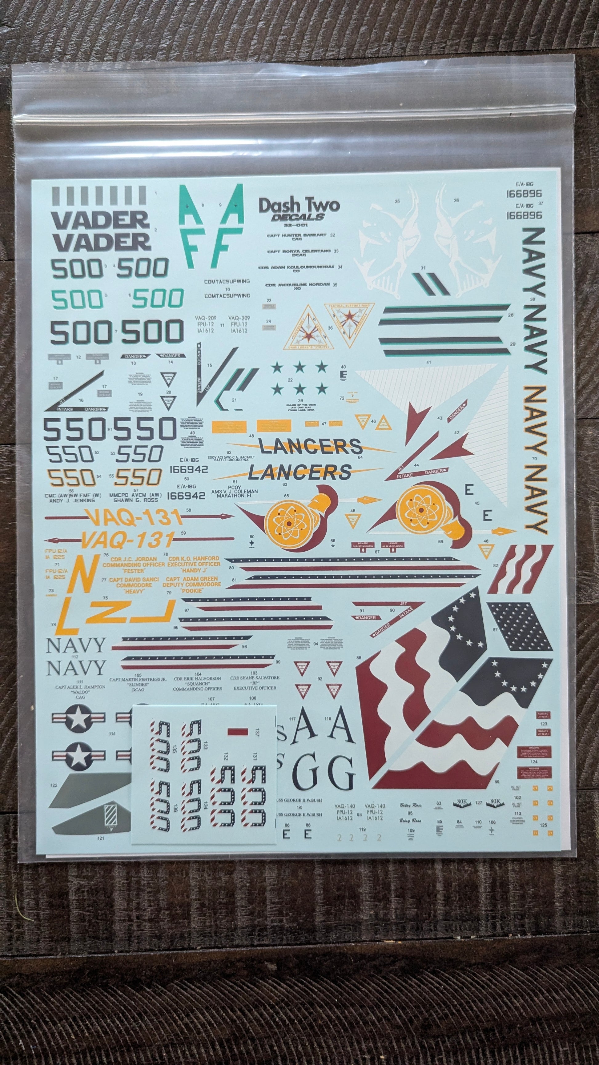 Dash Two Decals first sheet! Full 8.5"x11" sheet featuring 3 vibrant 1/32 E/A-18G Growler schemes.